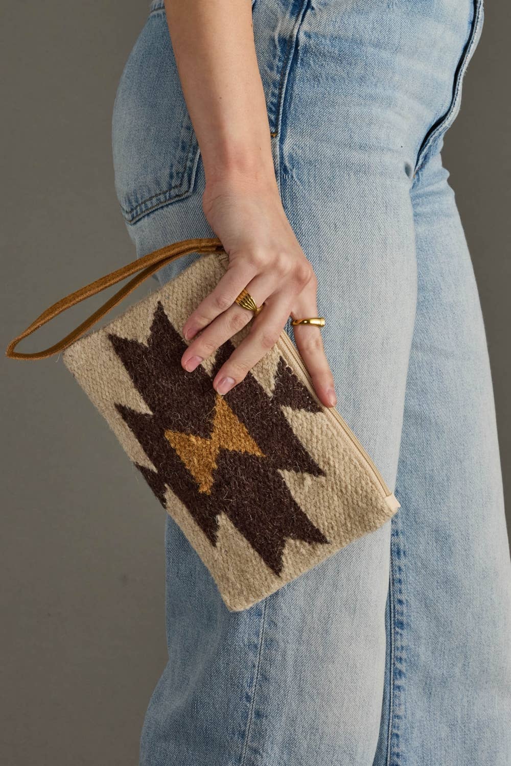 Cream, brown & tan western-inspired wristlet Suede pull 5" x 8" 80% Wool / 20% Cotton Lining: 100% Polyester
