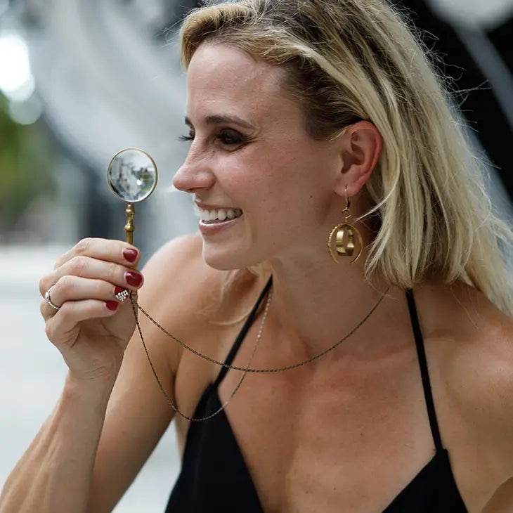 Magnifying glass with ornate handle on aged brass scroll chain. Metal: Aged Brass Size: 4" L Pendant, 32" Chain Lobster Clasp Materials: Working Magnifying Glass